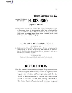 Am 7. Dezember veröffentlichten die Demokraten des Justizausschusses einen Bericht mit dem Titel Constitutional grounds for presidential impeachment (Begründungen der Verfassung für eine Anklage des Präsidenten), in dem die in der Verfassung genannten anklagbaren Vergehen näher erklärt, sowie die Geschichte, der Zweck und die Bedeutung der Impeachment ausgeführt werden. Außerdem sprechen sie darin sechs Irrtümer über das Amtsenthebungsverfahren an, die in letzter Zeit in der Öffentlichkeit kursierten. In der Einführung ist formuliert, dass die Anklage die letzte Antwort der Verfassung auf einen Präsidenten sei, der sich selbst fälschlich für einen Monarchen halte. Die in der Verfassung neben Verrat und Bestechung genannten „andere hohe Verbrechen und Vergehen“ (“other high crimes and misdemeanors”) als folgende drei: Machtmissbrauch, Verrat der Nation durch ausländische Verwicklungen und Korruption des Amtes und der Wahl. Nadler sagte in einem Statement: „Präsident Trump hat seine Macht missbraucht, die nationale Sicherheit verraten, unsere Wahlen korrumpiert, und all das für seinen persönlichen Vorteil.“[123] Er beschrieb das Dokument als den Erben des Berichts gleichen Titels aus dem Jahr 1974 zum Amtsenthebungsverfahren gegen Richard Nixon, der 1998 zum Amtsenthebungsverfahren gegen Bill Clinton aktualisiert, aber nicht vollständig neuverfasst worden war.[124]