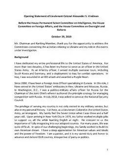 Am 29. Oktober sagte der Oberstleutnant Alexander Vindman, der höchste Experte für die Ukraine im National Security Council, als erster amtierender Mitarbeiter des Weißen Hauses aus, womit er trotz der Bemühungen der Regierung, Aussagen von Mitarbeitern des Weißen Hauses zu blockieren, einer Zwangsvorladung nachkam. In seinem Eröffnungsstatement sagte er, er sei im Frühling 2019 aufmerksam geworden auf Einflüsse von außen, die ein falsches Narrativ der Ukraine beförderten, das unvereinbar mit den übereinstimmenden Ansichten des ressortübergreifenden Gremiums sowie schädlich für die Regierungspolitik sei.[50] Vindman habe bei zwei Gelegenheiten seine Bedenken wegen der Regierungsbemühungen bezüglich der Ukraine an den Rechtsbeistand des Nationalen Sicherheitsrats weitergemeldet. Die erste fand nach einem Treffen am 10. Juli zwischen Oleksandr Danyljuk, dem Sekretär des Nationalen Sicherheits- und Verteidigungsrates der Ukraine, und Trumps Nationalem Sicherheitsberater John Bolton, bei dem auch Volker, Sondland und Energieminister Rick Perry anwesend waren. Dabei habe Sondland die Ukraine zu Ermittlungen aufgefordert als Bedingung für ein Treffen mit Trump. Vindman habe bei einer Nachbesprechung Sondlands Äußerungen als unangemessen bezeichnet und dies an den Anwalt des Nationalen Sicherheitsrates gemeldet.[51] Außerdem hatte er das Telefonat zwischen Trump und Selenskyj am 25. Juli mitgehört und seine Bedenken seinen Vorgesetzten mitgeteilt.[52] Auch berichtete Vindman, dass das Memorandum des Weißen Hauses zum Telefonat wesentliche Worte und Sätze Trumps bezüglich der Bidens ausgelassen habe[53] und an einigen Stellen offenbar absichtlich verändert worden sei. Für seine Aussagen wurde Vindnam von Trump, Republikanern und auf dem Fox News Channel diskreditiert und beschimpft.[54]
