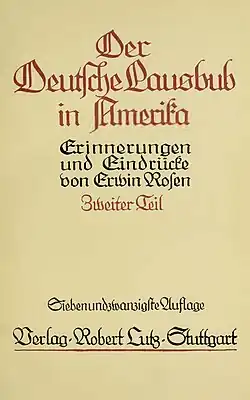 - Erwin Rosen: Der deutsche Lausbub in Amerika: Erinnerungen und Eindrücke. Teil 1. Verlag Robert Lutz, Stuttgart 1911; archive.org.