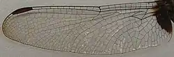 Die durchsichtigen Hinterflügel der Männchen schwanken in der Länge zwischen 22,5 und 27,5 Millimetern. Jene der Weibchen sind ungefähr gleich lang und messen zwischen 23,5 und 28,5 Millimeter. An der Basis der Flügel ist ein bräunlich schwarzer Fleck, der sich meist bis zur ersten oder zweiten Antenodalader ausbreitet. Im Vorderflügel fehlt dieser Fleck bei den Männchen häufig. An den Spitzen sind die Flügel leicht bräunlich angehaucht. Das Flügelmal (Pterostigma) misst bei beiden Geschlechtern zwischen 2,6 und 3,1 Millimeter.[1]