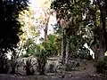 Zu dem Park gehörten ein künstlicher Felsen und eine Grotte aus Tuffsteinen, aus der das Wasser in Kaskaden hervorsprudelte.[60] Sie waren das Werk von Eugène Combaz, der auch die Grotten und Kaskaden im Bois de Boulogne und im Parc des Buttes-Chaumont konstruiert hatte.[61] Der Wasserfall wurde von einem Reservoir mit Nilwasser auf der Spitze des Felsens gespeist, das von der Kairoer Wassergesellschaft ständig mit Wasser gefüllt wurde. Der Wasserfall wieder speiste einen kleinen Bach, der in einen zentralen Teich floss.[49] Über der Grotte erhob sich ein Belvedere, der vollständig aus Palmenstämmen hergestellt war. Ihn erreichte man entweder über einen schattigen, sandigen Weg oder über verschiedene innere und äußere Pfade, die aus in den Fels gehauenen Stufen bestanden.[62] Von dem Belvedere aus hatte man einen schönen Ausblick nicht nur auf den Park, sondern ganz Kairo. Das eiserne Gerüst für diese Konstruktion war in Paris hergestellt worden.[60]