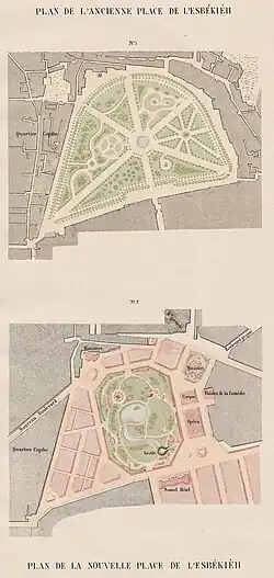 Nach Linant de Bellefonds entwickelten im Jahr 1863 Spekulanten, die die Gunst des Khediven besaßen, einen Plan, der darauf abzielte, den südlichen Teil des Esbekieh-Platzes abzutrennen, um dort Bauland zu schaffen und einen neuen Stadtteil anzulegen. Der Plan wurde von der Regierung aufgegriffen, und eine Gesellschaft gebildet, die mit der Durchführung der notwendigen Arbeiten und dem Verkauf der betreffenden Grundstücke beauftragt wurde.[44] Die Umsetzung dieses Plans begann allerdings erst 1866. Eugène Gellion-Danglar berichtet in einem Brief vom Dezember 1866, dass plötzlich alle Holzhütten unter den Bäumen, in denen sich vorher Cafés und Restaurants befunden hatten, verschwunden waren und man begonnen hatte, die Esbekieh-Promenade mit einer Mauer zu umgeben. Nach einigen Monaten seien die Arbeiten aber aufgrund des finanziellen Zusammenbruchs der Firma, die sie durchgeführt hatte, unterbrochen worden, und die Esbekieh seither nur noch ein mit Steinen und Gipssschutt bedeckter, unpassierbarer Ort, an dem niemand mehr spazierenging.[31] Nach Linant de Bellefonds wurde die Societé agricole, die Gesellschaft, die mit den Arbeiten beauftragt, bald wieder aufgelöst, und die ihr übertragenen Grundstücke von der Regierung wieder eingezogen.[45]
