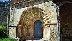 • Die Pfarrkirche Santa María ist – mit Ausnahme der Strebepfeiler – aus nur grob behauenen Bruchsteinen errichtet. Das unterhalb des Glockenturms (campanario) auf der Südseite befindliche Portal stammt von einem mittelalterlichen Vorgängerbau. Sein Gewände ist mehrfach zurückgestuft; die Archivolten zeigen sowohl figürliches (Älteste der Apokalypse) als auch geometrisches Dekor. Die schlanken figurlosen Kapitelle der eingestellten Säulen weisen auf den Übergangsstil zwischen Spätromanik und Frühgotik hin. Die Zwickel der Portalzone waren mit Fugenmalereien und anderem Dekor bemalt.