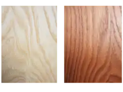 Eschen gehören zu den Bäumen mit fakultativer Farbkernbildung. Splintholz und Kernholz sind meist hell und leicht gräulich. Farblich ähnelt das Holz dem Eichenholz. Allerdings ist die Maserung etwas ausgeprägter und die länglich eingeprägten Poren fehlen.
