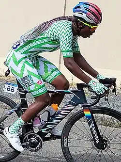 Afrikameister-Trikot Afrikameisterin – Zeitfahren, Keirin, Teamsprint (mit Tawakalt Yekeen und Grace Ayuba), Mannschaftsverfolgung (mit Mary Samuel, Tawakalt Yekeen und Treasure Coxson)