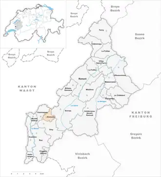 Zu Esmonts gehören einige Hofsiedlungen und Einzelhöfe. Nachbargemeinden von Esmonts waren Vuarmarens, Ursy und Siviriez im Kanton Freiburg sowie Brenles im Kanton Waadt.