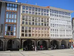 - Einige Arkadenhäuser am Hauptplatz zeigen die für Nordspanien (Santander, A Coruña) typischen, komplett verglasten Balkonfassaden, die im Winter für eine gewisse Wärme in den Wohnräumen sorgen. Wie einige ältere Häuser im Ort zeigen, waren nach Süden ausgerichtete, aber zur damaligen Zeit aus Material- und Kostengründen noch unverglaste Balkone schon im Mittelalter und in der frühen Neuzeit sehr beliebt. Im Erdgeschoss der Arkadenhäuser befanden sich Geschäfte aller Art – heute ist es manchmal zu einem Café umgebaut.