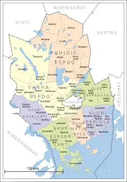 Espoo besteht aus sieben Stadtbezirken (suuralue), die sich wiederum in insgesamt 55 Stadtteile (kaupunginosa) unterteilen: