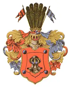 - Blasonierung des Wappens von 1663: In Rot ein vorwärtsgekehrter schwarzer Spangenhelm, begleitet von vier (2:2) blauen Kugeln. Auf dem rot-blau-golden bewulsteten Helm sechs (3:3) natürliche Pfauenfedern zwischen einer roten und einer blauen Fahne. Die Helmdecken sind rot-blau-golden.