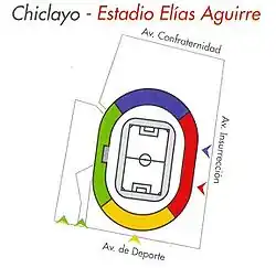 Das Estadio Elías Aguirre in Chiclayo, einer Stadt mit etwa 630.000 Einwohnern im Norden Perus, wurde im Jahre 1970 erbaut und noch im gleichen Jahr eröffnet. Seitdem trägt der örtliche Verein Juan Aurich seine Heimspiele im Stadion aus. Der Verein konnte bisher noch nie die peruanische Fußballmeisterschaft gewinnen, die beste Platzierung in der Primera División war ein zweiter Platz in der Spielzeit 1968. Aktuell spielt Juan Aurich in der ersten peruanischen Liga in den oberen Tabellenregionen. In den letzten Jahren nahm der Verein auch mehrfach an kontinentalen Wettbewerben teil, sodass im Estadio Elías Aguirre unter anderem Estudiantes de La Plata aus Argentinien und Club Bolívar aus Bolivien im Rahmen der Copa Libertadores 2010 gastierten.
