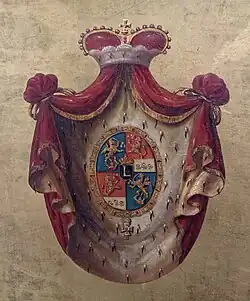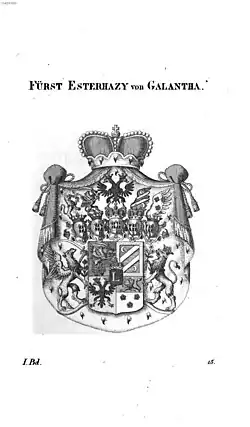 Mit der Erhebung Paul Esterházys in den Fürstenstand wurde 1687 das neue fürstliche Wappen durch Kaiser Leopold I. bestätigt. Es ist geviertet mit einem schwarzen Mittelschild, darin ein goldenes L (Initiale des Kaisers). In Feld 1 und 4 in Blau einwärts der gekrönte Greif mit Krummsäbel und Rosen. In den Rot und Silber geteilten Feldern 2 und 3 ein oben aus der Mitte wachsender, einwärts gekehrter, gekrönter goldener Löwe, in der erhobenen Linken drei weiße Rosen (Übernahme des Nyáry-Wappens), unterhalb drei rote Rosen (Übernahme des Thurzó-Wappens).[7] Durch die Erhebung der Reichsgrafschaft Edelstetten zu einer gefürsteten Reichsgrafschaft im Jahr 1804 erfolgte auch eine Aufbesserung des fürstlichen Wappens, wobei das Wappen der gefürsteten Grafschaft Edelstetten und der doppelköpfige Reichsadler des HRR inkludiert wurden.[8]