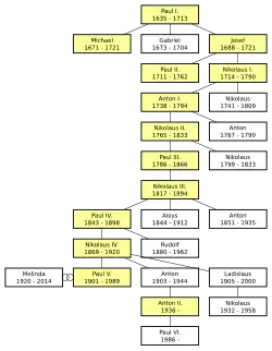 Zunächst bezog sich die Fürstenwürde nur auf Paul I. Erst 1712 wurde die Fürstenwürde auf den jeweils Erstgeborenen der Linie Pauls ausgedehnt. Die fürstliche Linie wählte Eisenstadt zu ihrer Residenz und baute eine dort bestehende Burg zum repräsentativen Schloss aus, Stammsitz blieb die Burg Forchtenstein. Im Franziskanerkloster Eisenstadt wurde 1705 die Familiengruft eingerichtet. Unter Kaiser Joseph II. wurde der Fürstentitel als Primogenitur erhalten und allen männlichen Mitgliedern der fürstlichen Linie der Titel eines Prinzen verliehen.