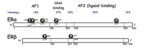 Da beide Subtypen in vielen Zellen gleichzeitig exprimiert werden, kommt es bei der hormonaktivierten Rezeptordimerisierung zur Bildung von ERα (αα) bzw. ERβ (ββ) Homodimeren oder ERαβ (αβ) Heterodimeren.