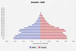 Eswatini hatte 2023 1,2 Millionen Einwohner.[15] Das jährliche Bevölkerungswachstum betrug + 0,8 %. Zum Bevölkerungswachstum trug ein Geburtenüberschuss (Geburtenziffer: 23,6 pro 1000 Einwohner[16] vs. Sterbeziffer: 11,9 pro 1000 Einwohner[17]) bei. Die Anzahl der Geburten pro Frau lag 2022 statistisch bei 2,8, die der Region Ost- und Süd-Afrika betrug 4,3.[18] Die Lebenserwartung der Einwohner Eswatinis ab der Geburt lag 2022 bei 56,4 Jahren[19]. Der Median des Alters der Bevölkerung lag im Jahr 2021 bei 21,5 Jahren.[20] Im Jahr 2023 waren 34,4 Prozent der Bevölkerung unter 15 Jahre,[21] während der Anteil der über 64-Jährigen 4,0 Prozent der Bevölkerung betrug.[22]