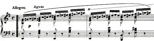 = 114 vor.[6] Als Vortragsanweisung gibt der Komponist ein sempre legato (immer gebunden) für die rechte Hand vor und erinnert den Spieler in der Notation noch sechsmal daran. Dieses für die Fingerübung wichtige Legato steht im starken Gegensatz zum Staccato der begleitenden Akkorde der linken Hand.