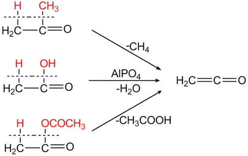 Keten entsteht durch Dehydratisierung von Essigsäure oder bei der Pyrolyse von Aceton. So wird beim Leiten von Acetondämpfen durch erhitzte Rohre oder elektrisch beheizte Metalldrähte bei 500–600 °C in Gegenwart von wenig Schwefelkohlenstoff Ethenon neben Methan in Ausbeuten bis 95 % d.Th. gebildet.[5][6] Die Ketonpyrolyse ist in der industriellen Chemie inzwischen von der Dehydratisierung von Essigsäure (Schmidlin-Bergman[7]-Wilsmore-Reaktion) weitgehend abgelöst worden.