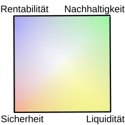 Unter ethischem Investment versteht man Geldanlagen, die neben den wirtschaftlichen Anlagezielen Rendite, Sicherheit und Verfügbarkeit[1] auch ethische bzw. nachhaltige Wertvorstellungen des Anlegers berücksichtigen. Aus dem magischen Dreieck der Vermögensanlage wird ein Viereck.[2] Oft wird auch von ethisch-nachhaltiger Geldanlage, nachhaltigem, ökologischem und sozial verantwortlichem Investment gesprochen (englisch socially responsible investment, SRI). Bei nachhaltigen Geldanlagen wird für die drei Nachhaltigkeitskriterien die Kurzbezeichnung ESG verwendet – nach den englischen Begriffen Environment (E), Social (S), Governance (G). Der ESG-Ansatz hat sich in der Finanzbranche zur Abgrenzung Nachhaltiger Geldanlagen als Standard entwickelt.