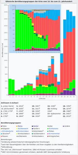 Angespannter war die Lage in der Schwarzmeerregion, wo die muslimisch-sunnitische Bevölkerung eine lange Geschichte politischer Loyalität zum mit Russland verfeindeten Osmanischen Reich aufwies, die auch religiös untermauert wurde – die regional dominierende sunnitische Rechtsschule der Hanafiten folgte damals dem Anspruch der osmanischen Sultane als Kalif (religiös-politisches Oberhaupt) der Muslime. Deshalb kam es in der Schwarzmeerregion besonders bei russisch-osmanischen Kriegen regelmäßig zu Aufständen gegen die russische Herrschaft, nach deren Niederschlagungen immer wieder viele Muhadschire aus Russland flüchteten. So verließen 1792–1922 über 80 % der Krimtataren die russische Krim (in statistischen Zahlen aufgrund des parallelen Bevölkerungswachstums nicht eindeutig sichtbar, nur im Vergleich mit der krimtatarischen Bevölkerung Anatoliens).[14] Unter den nördlich und östlich lebenden Nomaden, die zu den Verbänden der Nogaier gehörten, war der Anteil noch größer, in entfernteren Regionen dagegen weit geringer.