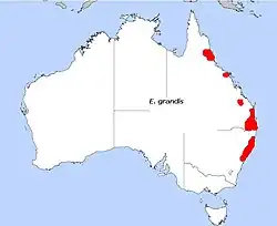 Eucalyptus grandis ist ursprünglich in Queensland und New South Wales beheimatet und kommt in feuchten Wäldern und am Rand von Regenwäldern vor.[4] In Queensland hybridisiert Eucalyptus grandis mit Eucalyptus pellita (Henderson, 2002).[8]