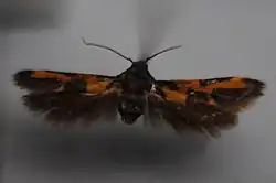 Die Falter erreichen eine Flügelspannweite von etwa 17 Millimeter. Der Kopf glänzt bronzebraun und ist grünlich getönt. Die Fühler sind dunkelbraun und haben einen leicht violetten Glanz. Im Subapikalbereich befinden sich etwa 9 weiße Segmente. Thorax und Tegulae glänzen bronzebraun und sind grünlich getönt. Die Vorderflügel haben eine hell orange Grundfärbung, an der Basis von Costalader und Flügelinnenrand sind sie dunkelbraun. An der Costalader befindet sich ein keulenförmiger Fleck. Von der Mitte der Costalader bis zu 4/5 der Vorderflügellänge verläuft ein dunkelbrauner Costalstrich. In Richtung der Flügelbasis ist er am breitesten und umschließt hier einen kleinen orangen subcostalen Fleck. Der Flügelinnenrand ist vom ersten Drittel bis zum Apex dunkelbraun, eine orange Binde unterbricht diesen Bereich hinter der Mitte. Ein gelboranger Costalstrich befindet sich bei 4/5 der Länge der Costalader. Zur Zeichnung gehören vier höckerartige, bläuliche oder leicht violett glänzende Flecke. Der erste befindet sich am distalen Ende des keulenförmigen Flecks. Der zweite und dritte Fleck befindet sich beidseits der Analfalte am basalen Rand des dunkelbraunen Bereichs am Flügelinnenrand. Der vierte und kleinste Fleck liegt unterhalb des orangen Subcostalflecks. Ein dunkler, violett und grünlich schimmernder schmaler Strich verläuft entlang der Analfalte. Er beginnt distal bei den beiden höckerartigen Flecken am dunkelbraunen Bereich des Flügelinnenrandes und reicht bis zum Flügelaußenrand. Die Fransenschuppen sind graubraun. Die Hinterflügel schimmern graubraun und haben einen orangen Glanz.[1]