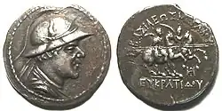 Die genaue Herkunft des Herrschers ist umstritten, wie überhaupt viele Einzelheiten der Geschichte des griechisch-baktrischen Reiches. Einige Münzen zeigen vielleicht die Eltern Eukratides’ I. Sein Vater war ein gewisser Heliokles, seine Mutter eine gewisse Laodike, die vielleicht mit dem Königshaus der Seleukiden verwandt war,[4] da der Name Laodike in diesem Haus sehr beliebt war. Der Name ist jedoch auch woanders bezeugt, so dass diese Verbindung nicht zwingend ist.[5] Eukratides I. scheint jedenfalls nicht mit der Dynastie des Euthydemos I. verwandt gewesen zu sein, die vorher in Baktrien regierte.