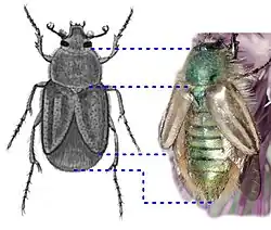 | Abb. 1: Ausschnitt Halsschild vor dem Schildchen, Hinterrand z. T. rot |