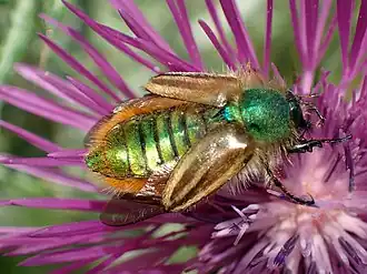 Kopf und Halsschild sind metallisch grün bis goldgrün glänzend, selten blaugrün. Die Flügeldecken sind scheinbar hell- und dunkelbraun längs gestreift. Die Oberseite des Hinterleibs, die beim Wegklappen der Flügel sichtbar wird, ebenso wie die Körperunterseite sind gold bis goldgrün.