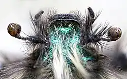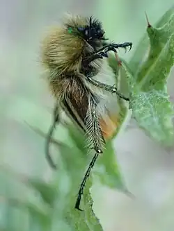 Der grüne Kopf (Abb. 2) ist weiß bis graugelb lang behaart, im Bereich der Augen ist die Behaarung schwarz. Die zehngliedrigen Fühler haben ein großes Basalglied. Dieses ist wie das folgende kugelige Glied dicht lang schwarz behaart. Die drei letzten Fühlerglieder bilden eine rundliche, knopfartige Keule. Die Fühler sind schwarz, die Keule braunrot aufgehellt. Der über der Oberlippe liegende Clypeus ist etwa rechteckig, vorn und an den Seiten steil aufsteigend und vorn leicht konkav. Beim Weibchen ist er vorn angedunkelt. Er ist durch eine deutliche Naht von der Stirn abgesetzt. An der Basis ist er zur Aufnahme der Fühlereinlenkung ausgerandet. Der Oberkiefer ist von oben nicht sichtbar. Der Außenrand der Mandibeln ist abgerundet, die Spitze zweizähnig.