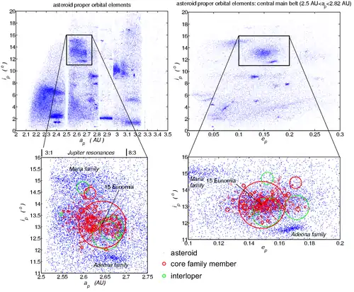 Die Eunomia-Familie liegt zwischen den 3:1- und 8:3-Bahnresonanzen mit Jupiter mit größeren Bahnneigungen.