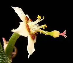 Kurz gestielte Cyathien erscheinen einzeln oder in kleinen Gruppen aus den Blattachseln. Ihre rötlichen Nektardrüsen tragen weiße Anhängsel, die wie Blütenhüllblätter wirken und so den Cyathien fast das Aussehen echter Blüten verleihen. Die kahlen, fast kugeligen Kapselfrüchte enthalten konische, leicht gerunzelte Samen mit winzigen Carunculae.