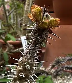 die Blätter sind von den Trieben weg gebogen und die Cymen stehen an sehr kurzen Stielen - Euphorbia beharensis var. beharensis