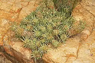 Die Cyathien stehen einzeln an den Zweigspitzen an 5 bis 10 Millimeter langen Stielen und erreichen einen Durchmesser von 6 Millimeter. An diesen langlebigen Stielen werden vier bis sechs Tragblätter ausgebildet. Die einzeln stehenden Nektardrüsen besitzen an ihren Rändern zwei bis drei etwa 1 Millimeter lange Anhängsel. Die stumpf gelappte Frucht ist sitzend. Über den Samen ist nichts bekannt.
