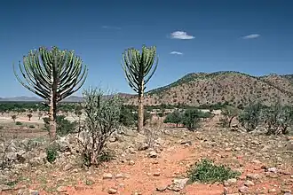 Euphorbia eduardoi ist im Süden von Angola bis in den Norden von Namibia auf steinigen Hügeln verbreitet.