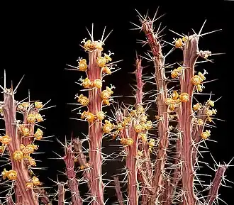 Der Blütenstand besteht aus einfachen und einzelnen Cymen, die nahezu sitzend sind. Die Cyathien erreichen einen Durchmesser von 4,5 Millimeter. Die rechteckigen Nektardrüsen sind bräunlich gefärbt und berühren sich. Die stumpf gelappte Frucht ist mehr oder weniger sitzend und wird etwa 2,5 Millimeter lang und 3 Millimeter breit. Der eiförmige Samen wird 1,75 Millimeter lang und 1,5 Millimeter breit. Die Samenoberfläche ist mit flachen Warzen besetzt.