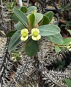 Der Blütenstand besteht aus ein- bis zweifach gegabelten Cymen, die sich an 5 Millimeter langen Stielen befinden. Die ausgebreiteten und gerundeten Cyathophyllen werden bis 11 Millimeter lang und 7 Millimeter breit. Sie sind gelb gefärbt und verfärben sich später nach rot. Die Cyathien erreichen 5 Millimeter im Durchmesser und die eiförmigen Nektardrüsen sind gelb gefärbt. Der Fruchtknoten ist sitzend. Über die Früchte und Samen ist nichts bekannt.