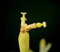 Der Blütenstand besteht aus büscheligen Cymen. Die Cyathien sind entweder männlich oder weiblich. Pro Cyathium werden 3 elliptischen Nektardrüsen ausgebildet, die einzeln stehen. Die kugelförmige Frucht wird etwa 9 Millimeter groß und befindet sich an einem bis 7 Millimeter langen Stiel, der zurückgebogen ist. Der kugelförmige Samen besitzt ein Anhängsel.