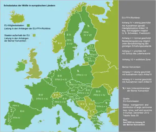 Der Schutzstatus des Eurasischen Wolfs bzw. der Art, zu der er als Unterart gehört, ist in den Ländern seines Vorkommens unterschiedlich. In den Mitgliedstaaten der Europäischen Union ist er in den Anhängen der FFH-Richtlinie entweder im Anhang IV oder im Anhang V gelistet, in einigen gleichzeitig in Anhang II. In den Ländern außerhalb der EU hängt sein Schutzstatus davon ab, ob sie zu den Unterzeichnerstaaten der Berner Konvention und/oder des Washingtoner Artenschutzabkommens gehören (siehe auch Wolf#Gesetzlicher Schutz).[46][47]