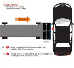 Der Fahrzeug-Seitenaufprall, der Aufprall eines anderen Fahrzeugs von der Seite, wird mittels einer deformierbaren Barriere simuliert, die mit 60 km/h gegen die Fahrertür gefahren wird.[8] Die Barriere hat ein Gewicht von 1400 kg.[9] Bis einschließlich des Jahres 2014 hatte diese ein Gewicht von 950 kg.[10]
