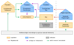 Die EU stellt eine eigenständige Rechtspersönlichkeit[8] dar und hat daher Einsichts- und Rederecht bei den Vereinten Nationen.[9] Das politische System der EU, das sich im Zuge der europäischen Integration herausgebildet hat, basiert auf dem Vertrag über die Europäische Union und dem Vertrag über die Arbeitsweise der Europäischen Union. Es enthält sowohl überstaatliche als auch zwischenstaatliche Elemente. Während im Europäischen Rat und im Rat der Europäischen Union die einzelnen Staaten mit ihren Regierungen vertreten sind, repräsentiert das Europäische Parlament bei der Rechtsetzung der EU unmittelbar die Unionsbürger. Die Europäische Kommission als Exekutivorgan und der EU-Gerichtshof als Rechtsprechungsinstanz sind ebenfalls überstaatliche Einrichtungen.