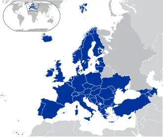 Die Bundesrepublik Deutschland trat dem Gremium am 14. Juli 1950 zunächst als assoziiertes Mitglied bei und wurde im Mai 1951 vollberechtigtes Mitglied.[18] Das Saarland (bis zum 1. Januar 1957 autonomer Staat) war bereits zum 13. Mai 1950 assoziiertes und ab 2. Mai 1951 ordentliches Mitglied. Österreich erlangte 1956 (nach der Wiedererlangung seiner Souveränität durch den Staatsvertrag 1955), die Schweiz am 6. Mai 1963[19] die Mitgliedschaft.