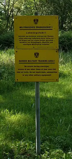 Das Gelände ist teilweise ein Garnisonsübungsplatz, der allerdings nicht mehr oft verwendet wird. Wegen der Gefahr von Blindgängern besteht ein Wegegebot, entsprechende gelbe Warntafeln sind aufgestellt.[5]