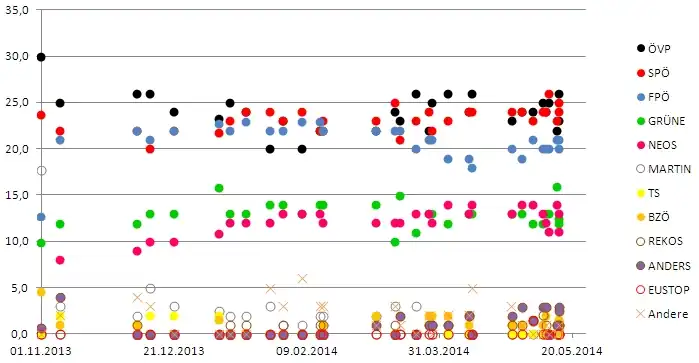 - ↑ Wahlumfragen und Sonntagsfragen aus Österreich. In: Wahlumfragen auf neuwal.com. neuwal.com, abgerufen am 25. Mai 2014.