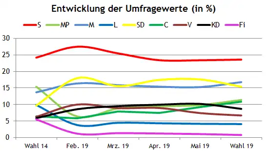 | Demoskop[16] | 24.04.2019 | 23,4 | 9,0 | 17,0 | 3,3 | 19,3 | 6,1 | 7,9 | 10,4 | 1,0 | 2,6 |