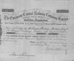 Die European Central Railway Company hatte ein Kapital von 700 000 Pfund Sterling in Form von Aktien aufgenommen, die in Stückelungen von 40 Pfund Sterling oder 1000 Schweizer Franken ausgegeben worden waren, was darauf hindeutet, dass man auf Schweizerische und französische Investoren hoffte. Das Aktienkapital hätte im Februar 2020 ungefähr eine Kaufkraft von 106 Mio. Euro entsprochen,[10] wobei aber nur etwa 20 % des Aktienkapitals einbezahlt worden war, weil die Investoren hofften, die Bahn weiter verkaufen zu können.[1]
