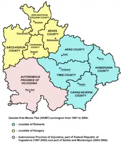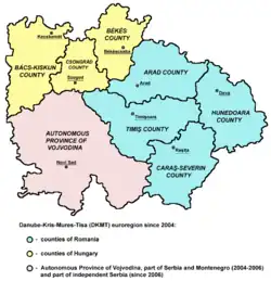 - ↑ Universität Tübingen: Die Euroregion Donau-Kreisch-Marosch-Theiß (DKMT), als Modell grenzüberschreitender Entwicklung in Südosteuropa. In: uni-tuebingen.de. Juni 2005, ehemals im (nicht mehr online verfügbar); abgerufen am 3. April 2011. (Seite nicht mehr abrufbar. Suche in Webarchiven)