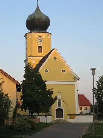 Die heutige Kirche wurde in der Barockzeit ab 1719 an der Stelle der früheren Kirche erbaut und 1736 geweiht. Sie besteht aus einem dreijochigen Langhaus mit Vorzeichen und einem im Osten angesetzten, 1734 in dieser Form ausgebauten Chorturm, der im Untergeschoss quadratisch ist, im Obergeschoss ein Oktogonmit einer Zwiebelhaube aufweist. Der viersäulige Hochaltar von 1725 hat lebensgroße Holzfiguren des hl. Josef und des hl. Joachim eines Bildhauers aus Velburg; das Altarblatt zeigt die Verehrung Mariens im Himmel durch Heilige und die Diskussion von Bischöfen über das Glaubensgeheimnis der Himmelfahrt Mariens. Das Deckenfresko über dem Altar stellt Maria als Schutzengelmadonna mit der Äbtissin von Neuburg dar. Das Langhausdeckenfresko Sieg Michaels mit apokalypt. Weib, Sündenfall, Himmelfahrt Mariä sowie die Fresken David, Madonna mit Kind, Triumph Judiths / Ruth und die Darstellung im Tempel sind von dem Kunstmaler Josef Wittmann im Jahre 1917 gemalt. Die Seitenaltäre sind den Vierzehn Nothelfern und dem hl. Wendelin gewidmet. – Die Pfarrei wird seelsorgerlich von Töging aus betreut.