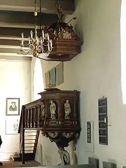 Die aus Eiche gefertigte Kanzel ist eine Stiftung des Freiherrn von Schwarzenberg und seiner Gattin Anne von Waddewarden, Herrin auf Burg Fischhausen.[2] Sie stammt aus dem Jahr 1634. Der Kanzelkorb, der auf der Figur des die Gesetzestafeln zeigenden gehörnten Mose ruht, zeigt die alabasterfarben gefassten vier Evangelisten mit den sie kennzeichnenden Attributen: Löwe (Markus), Stier (Lukas), Adler (Johannes) und Mensch (Matthäus). Auf der unteren Seite des Schalldeckels findet sich das Bild einer schwebenden Taube, Symbol des Heiligen Geistes. Die Figur des Christus, die eine Siegesfahne in der Hand hält, krönt den Kanzelhimmel. Der langgestreckte Laufgang verband früher Kanzel und Pastorenstuhl. Er ist mit gemalten Personifikationen der drei christlichen Tugenden Glaube, Liebe und Hoffnung sowie der vier Kardinaltugenden (Gerechtigkeit, Tapferkeit, Klugheit und Mäßigung) geschmückt.[10]
