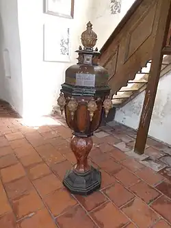 Die Taufe ist das Geschenk einer Landrichterwitwe aus dem 17. Jahrhundert, genannt Moder Lohe [Mutter Lohe]. Es wurde 1634 der Kirchengemeinde übereignet Das Material des kunstvoll verzierten Taufbeckens besteht aus Holz. Es hat die Form eines blütenförmigen Kelches.[11]