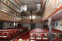 An den Längsseiten des Kirchenschiffes stehen dreistöckige hölzerne, farbig gefasste Emporen mit vertäfelten Brüstungen, an der Schmalseite eine zweistöckige Empore mit der Orgel. An der Brüstung der Orgelempore ist ein Ölgemälde der Himmelfahrt Jesu, genau darunter an der untersten Empore ein Ölgemälde, Aaron mit dem Weihrauchgefäß im Allerheiligsten des Tempels.