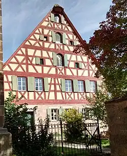 Der zweigeschossige Satteldachbau mit teils verputztem Fachwerk über massivem Quadermauerwerk im Erdgeschoss besitzt Ladeöffnungen im dreigeschossigen Giebel und eine klassizistische Haustüre.